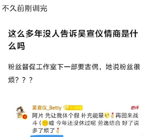 在这次之前吴宣仪刚训过一次粉了,因为粉丝许愿她下一部作品是古偶,她就说自己想休息不要烦。